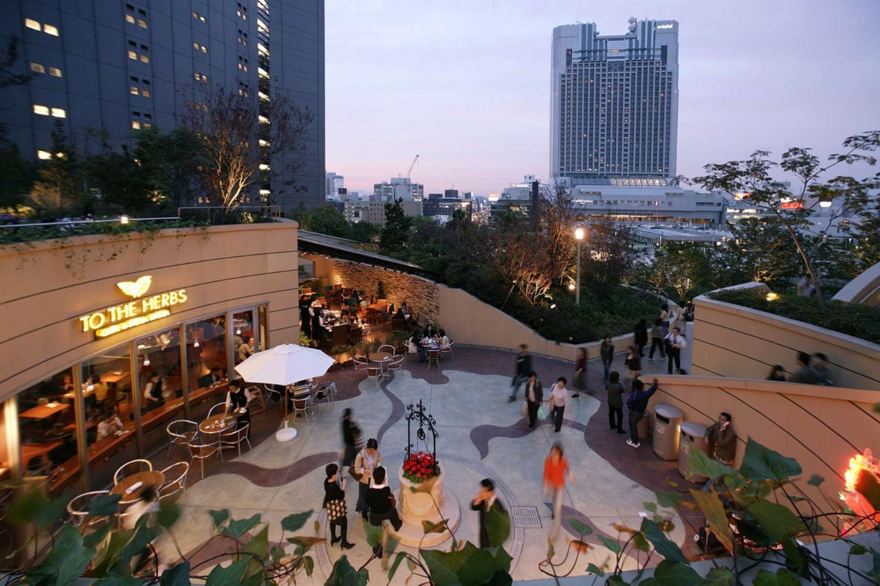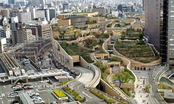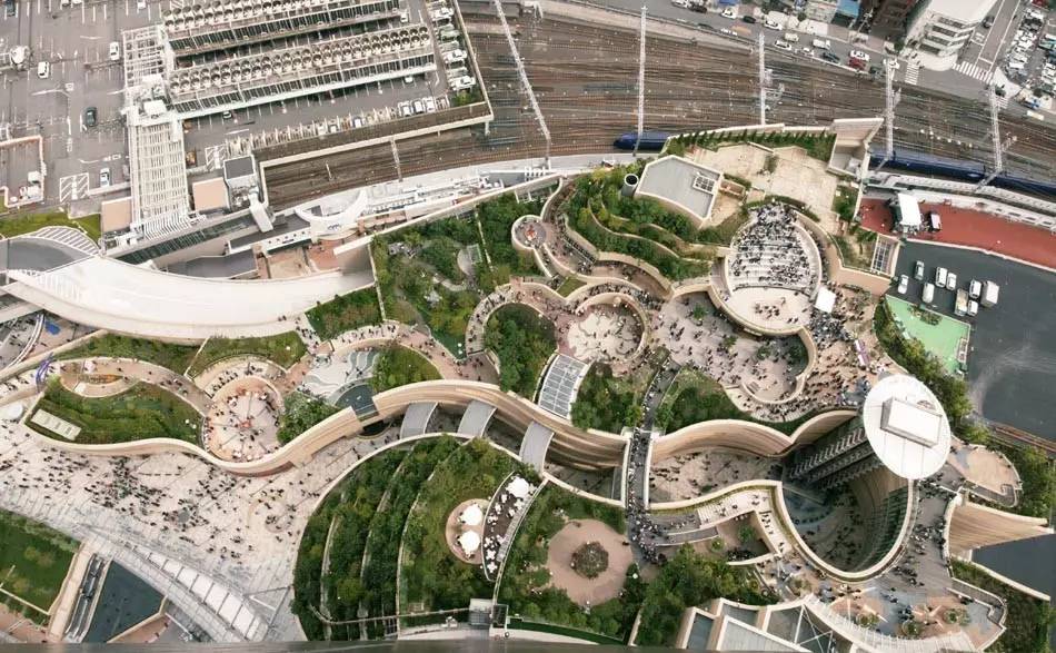 讲到购物中心退台设计一定首先想到难波公园这个典范,其总体建筑外观层层仄仄,是一座看起来如同空中园一样的完美建筑。原址是一座棒球馆,位于邻近难波火车站的一片新商业区,离机场一站之遥,将城际列车、地铁等交通枢功能与办公、酒店、住宅完美结合,是日本开发成功的城市综合体的代表项目。