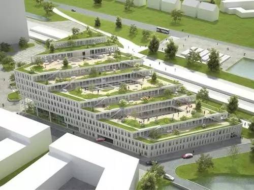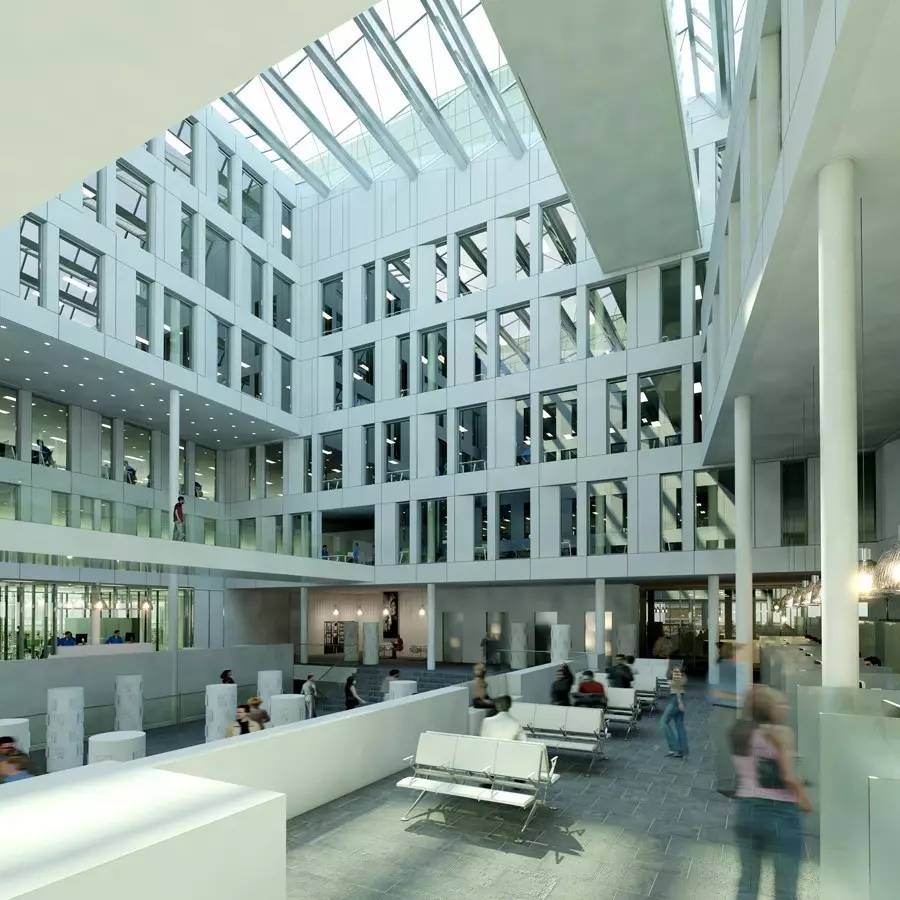 该建筑由办公空间、室内共享大厅共同构成。设计师试图构筑一个开放的建筑,吸引人并达到可持续发展。该设计的核心部分是开敞的“大市场”或者叫“广场”的室内空间,这里创造了和谐的交互共享大厅空间。