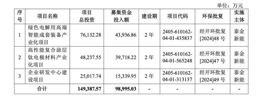 据其招股书显示,泰金新能此次IPO拟募集资金重点投向三大核心项目,合计拟投入募集资金总额9.90亿元,三个项目建设期均为2年。其中,绿色电解用高端智能成套装备产业化项目总投资7.61亿元,拟投入募集资金4.39亿元;高性能复合涂层钛电极材料产业化项目总投资4.82亿元,拟投入募集资金3.97亿元;企业研发中心建设项目总投资2.50亿元,拟投入募集资金1.53亿元,三大项目合计总投资达14.94亿元。