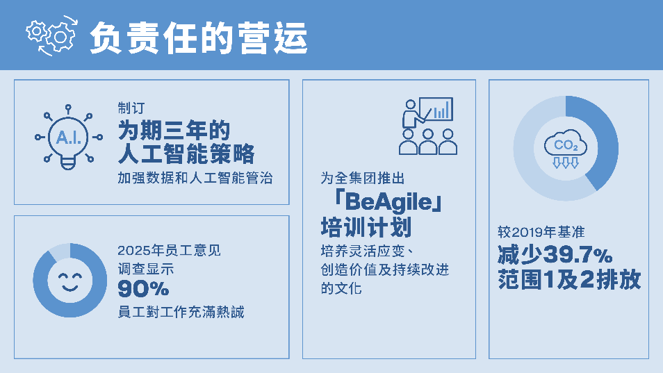 ●于2025年,集团已有18%的员工0F 完成人工智能技术培训,目标是在2026年实现35%员工具备运用人工智能的能力,并于 2027 年将此比例进一步提升至50%