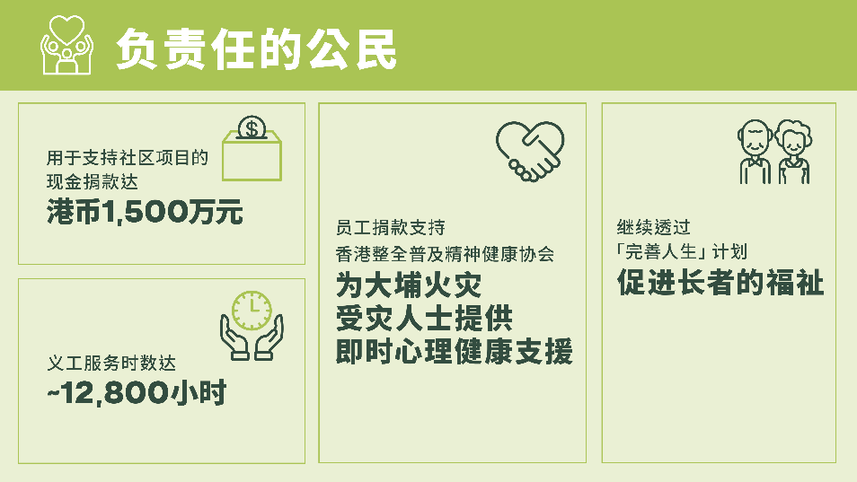 因应大埔宏福苑火灾事件,本行向香港特区政府的援助基金捐赠港币1,000万元,并设立“东亚银行社区同行基金”鼓励集团同事捐款支持,透过香港整全普及精神健康协会为有需要的居民免费提供专业心理及精神治疗服务。中国内地同事亦透过中国社会福利基金会,向香港五间社福机构捐款。