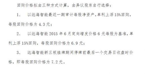 对于异议股东的股票,达海智能提供了三种回购价格,分别是4.3元、6.9元、7.2元,具体计算方式如下: