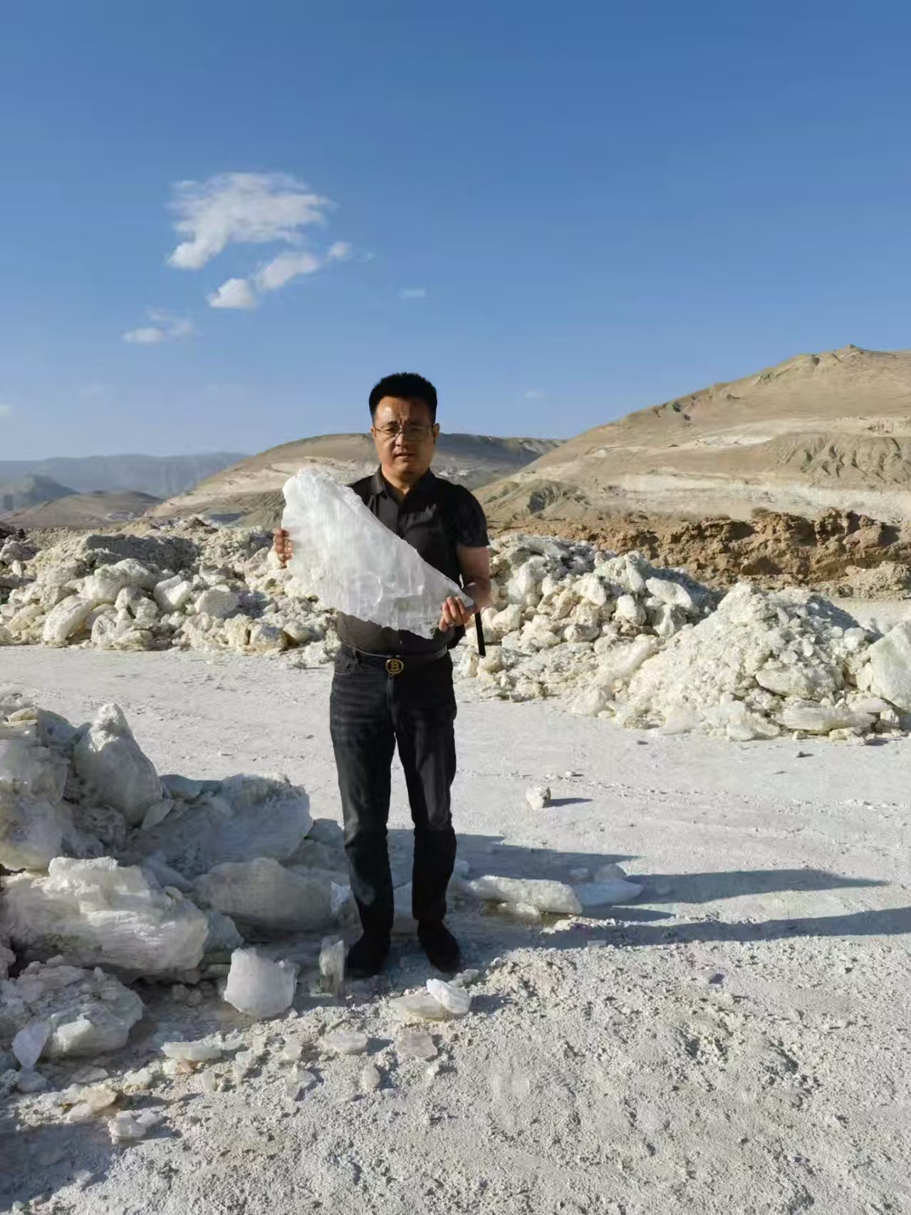 但下了摩托车,神奇的一幕出现了。谭小林穿着高帮皮鞋往地上轻轻一踢,踢开了两到三厘米的地表,露出一道闪闪发光的口子,许多透明晶体反射着阳光,“看起来就像钻石一样。”他抬头望向四周,想到无垠的沙漠底下都是这样“钻石”,“我当时心里那个喜啊。”村民用翻译器说,“谭先生,我不知道这个矿石是什么。”