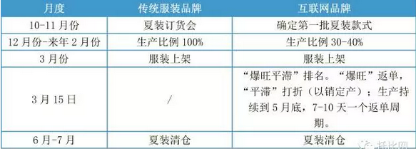 传统的工厂2月份夏装已经生产完,一般4月份开始生产秋装。但是韩都衣舍的供应链,一直到5月还在生产夏装。卖的好的爆款还在返单,新的款继续生产,只不过越往后生产的单量比较少。因为到了季末,到5月基本不返单了,7-10天一个返单周期,到6月份也夏季清仓,开始做秋装的开季。
