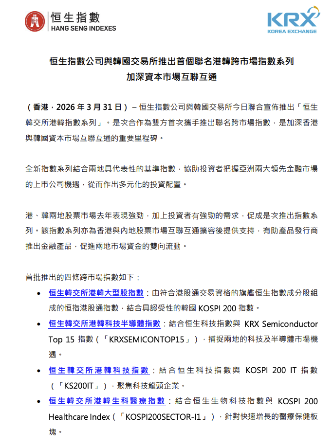 3月31日,恒生指数公司与韩国交易所联合宣布推出“恒生韩交所港韩指数系列”。是次合作为双方首次携手推出联名跨市场指数。该指数系列亦为香港与内地股票市场互联互通扩容后提供支持,有助产品发行商推出金融产品,促进两地市场资金的双向流动。恒生指数公司与韩国交易所将计划于今年稍后推出更多主题指数。