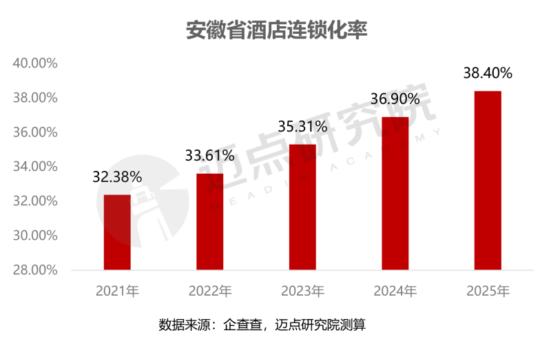 从连锁化率来看,安徽省酒店连锁化进程持续推进,2021-2025年连锁化率从32.38%攀升至38.40%,年均增幅约1.5个百分点,整体保持稳健增长态势。显示出省内单体酒店向品牌化转型的强劲动力。随着酒店集团向三四线城市及县域市场下沉,未来连锁化率仍有较大提升空间,区域不均衡问题也将逐步改善。