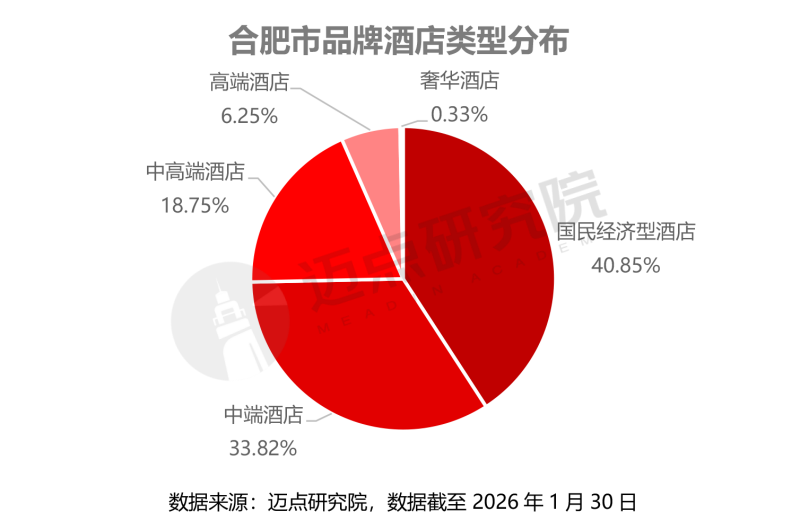 从核心城市合肥的品牌酒店结构来看,国民经济型与中端酒店占据绝对主导,国民经济型酒店占比40.85%,中端酒店占比33.82%,两者合计覆盖超七成市场,主要满足大众商务出行与基础旅游住宿需求;中高端酒店占比18.75%,高端酒店占比6.25%,奢华酒店仅占0.33%,整体呈现“金字塔型”供给结构,高端与奢华品类供给稀缺,且高度集中于核心城市,与安徽省整体市场格局高度吻合。