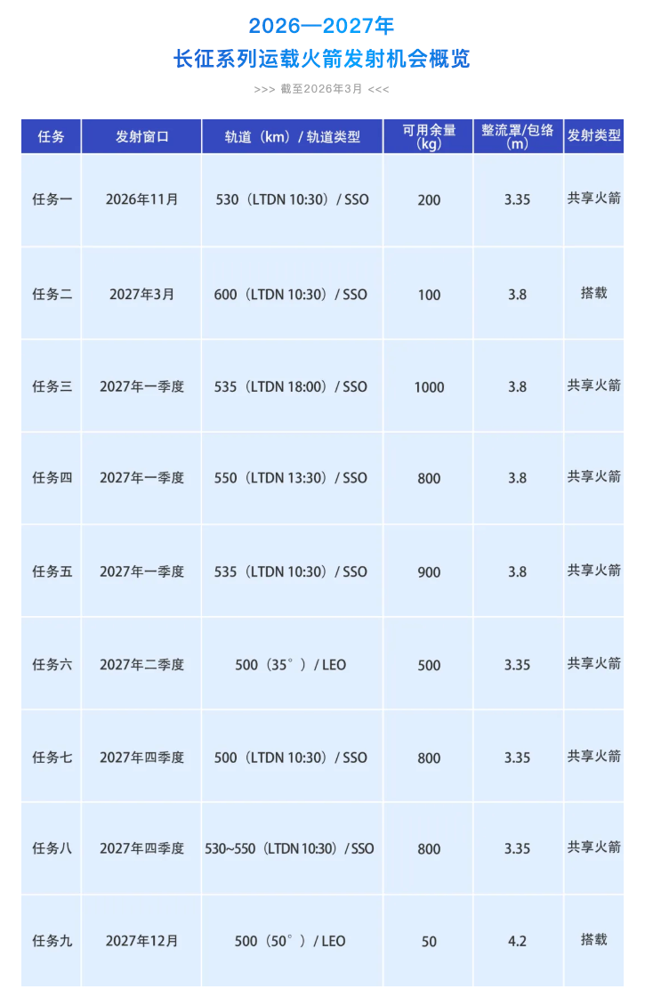 3月31日,中国商火发布2026-2027年中国航天科技集团有限公司运载火箭最新搭载及拼车机会。据了解,中国商火是中国航天科技集团商业火箭研制和国内商业发射服务的运营主体。