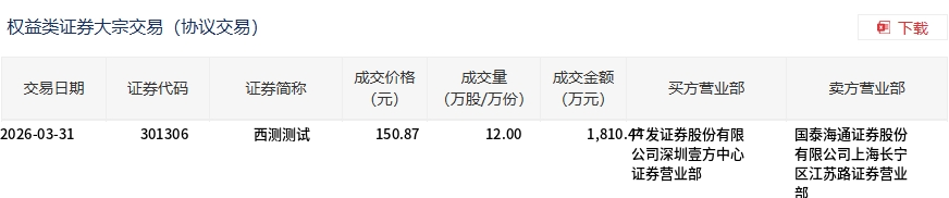 3月31日,西测测试大宗交易成交12万股,成交额1810.44万元,占当日总成交额的0.86%,成交价150.87元,较市场收盘价157.16元折价4%。