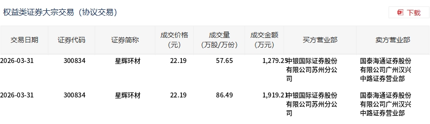 3月31日,星辉环材大宗交易成交144.14万股,成交额3198.46万元,占当日总成交额的8.57%,成交价22.19元,较市场收盘价30.2元折价26.52%。