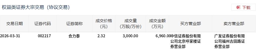 3月31日,合力泰大宗交易成交3000万股,成交额6960万元,占当日总成交额的18.42%,成交价2.32元,较市场收盘价2.36元折价1.69%。