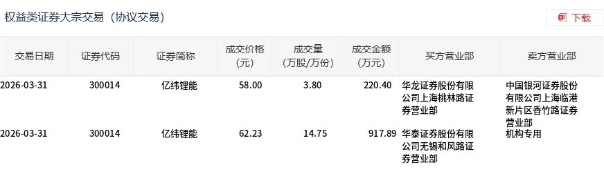 3月31日,亿纬锂能大宗交易成交18.55万股,成交额1138.29万元,占当日总成交额的0.15%,成交均价61.36元,较市场收盘价62.23元折价1.39%,其中最高成交价62.23元,最低成交价58元。