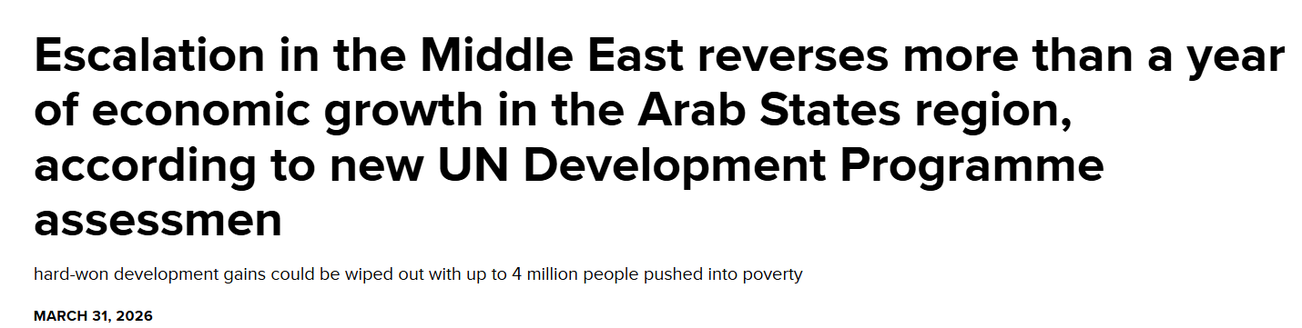 联合国开发计划署3月31日发布报告显示,中东地区持续五周的军事冲突升级可能导致该地区各国经济损失相当于国内生产总值(GDP)的3.7%至6.0%,即1200亿至1940亿美元,超过该地区2025年的累计GDP增长。