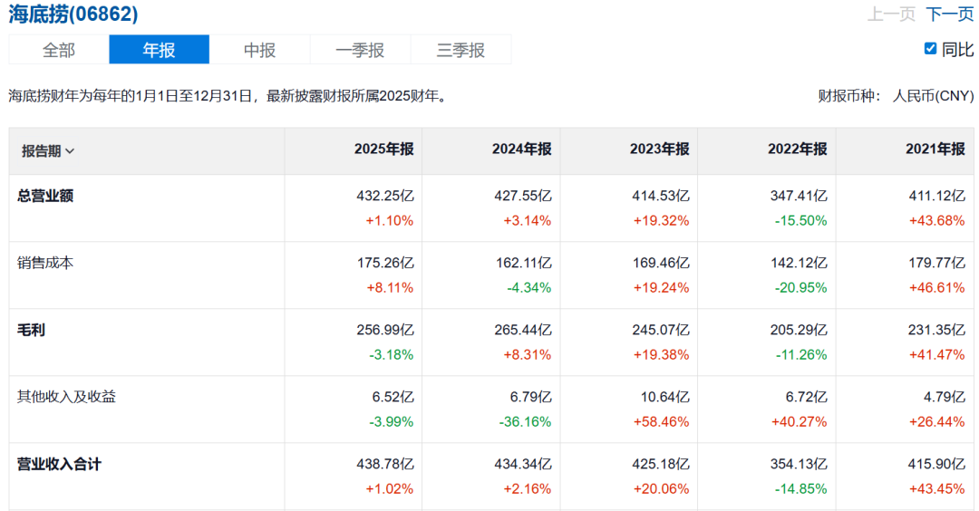 数据显示,海底捞几年来一直处于停滞之中。2022年末门店总数为1371家,2025年末也只有1383家。营收方面,2023年只比2021年高了0.8%,2024年稍回升至同比增长3.1%,紧接着便是2025年的1.1%。
