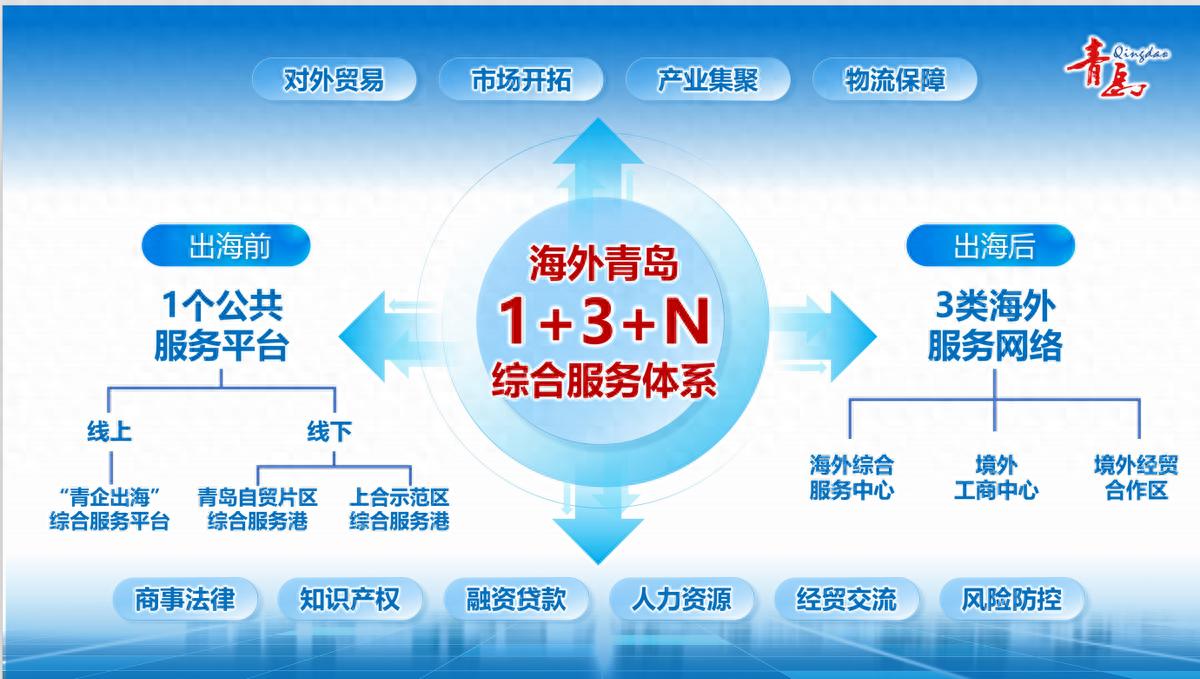 如果把企业出海比作一场远航,那么“海外青岛20条”的发力点,就是既为船队建造一个功能完备的“母港”,又在全球布设一个又一个随时可以停靠补给的“驿站”。这一布局的核心,是早已先行先试的“1+3+N”综合服务体系——搭建1个线上+线下综合服务公共平台、规划3个海外服务网络、协同推动N项专业精准服务。