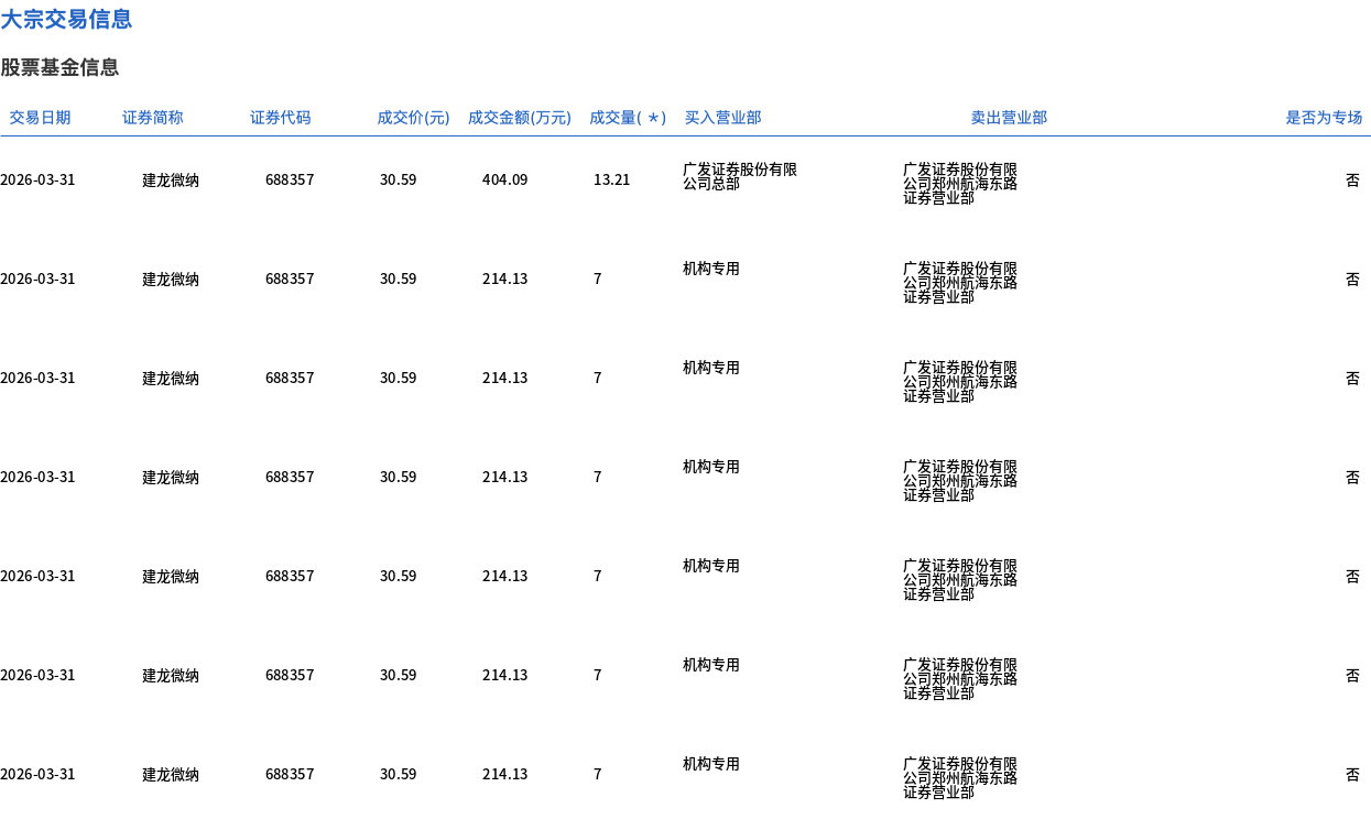 3月31日,建龙微纳大宗交易成交55.21万股,成交额1688.87万元,占当日总成交额的24.23%,成交价30.59元,较市场收盘价33.25元折价8%。