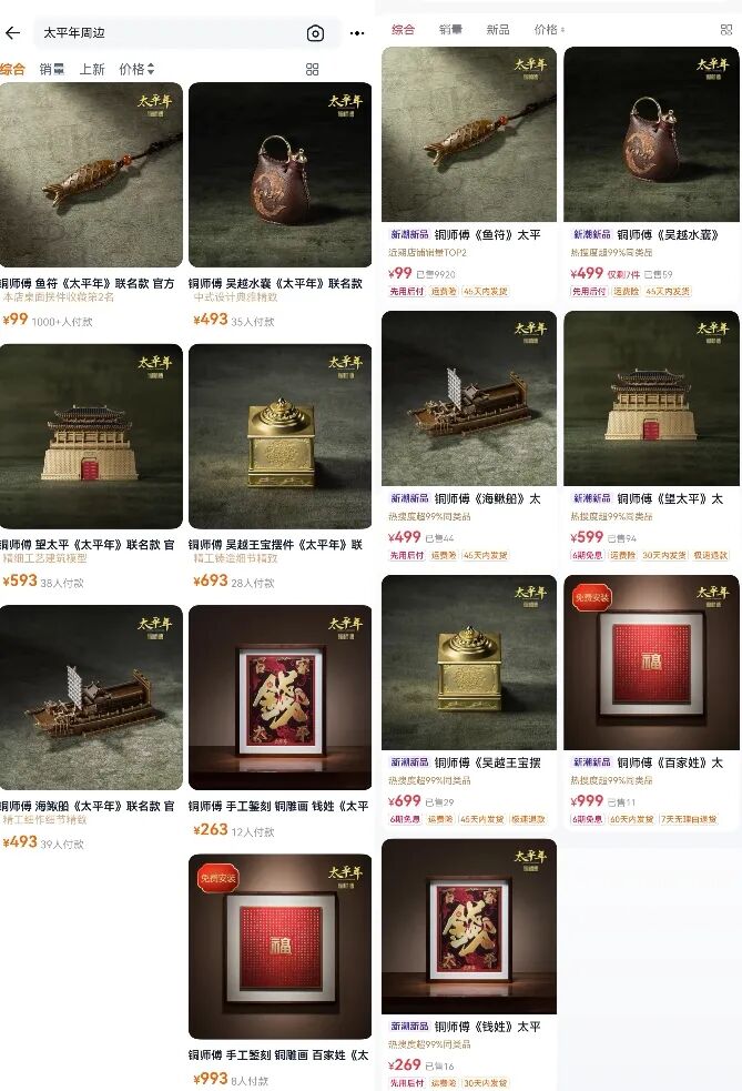 但这份热度,却未能辐射到同系列其他产品。经剁椒Spicy查询,铜师傅抖音官方旗舰店和天猫官方旗舰店“天平年周边”相关产品中,“黄铜鱼符”之外,吴越水壶、海鳅船、望太平等联名产品销量停留在几十件。这意味着,其爆款的流量红利终究未能转化为系列产品的市场认可。