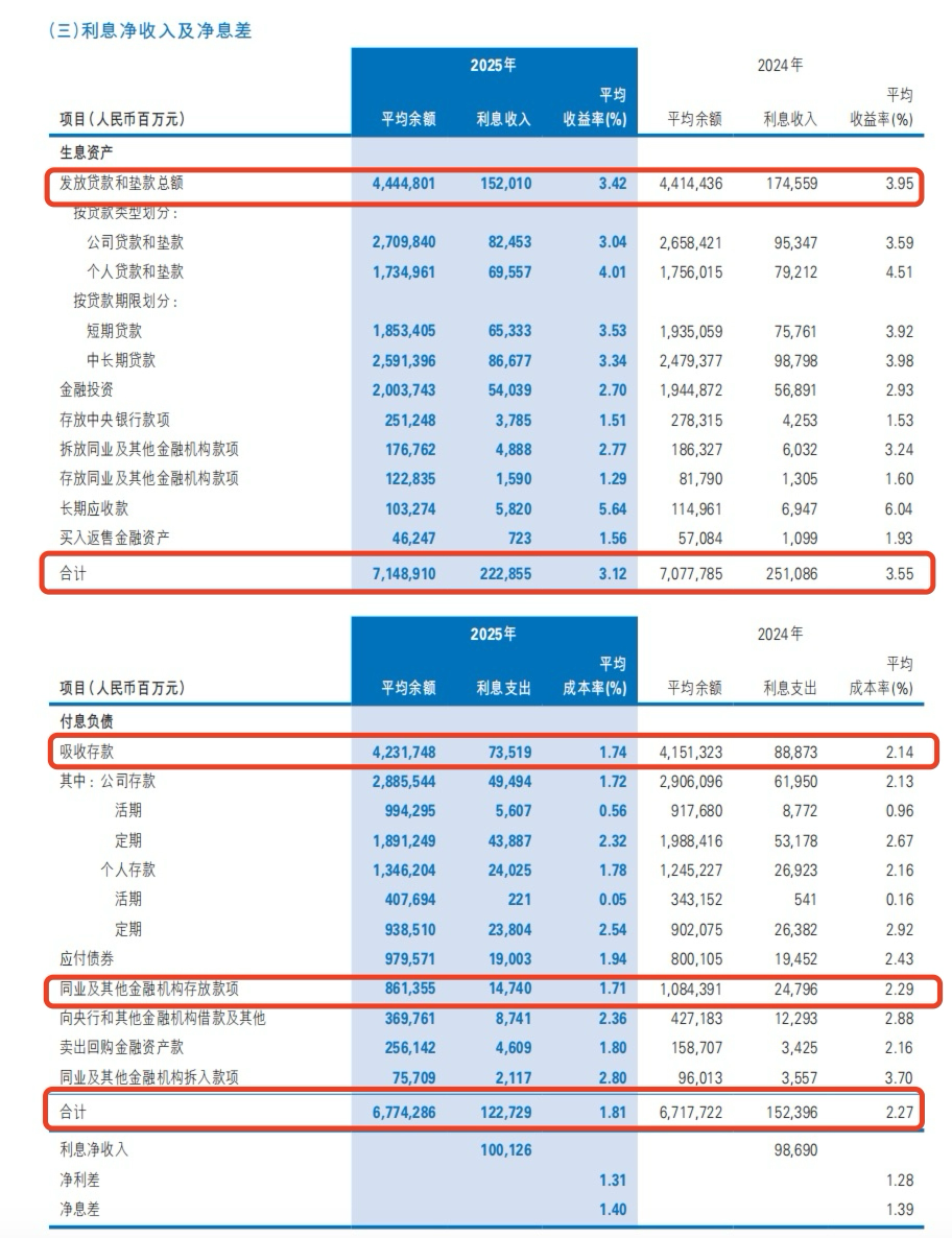 年报数据显示,2025年民生银行负债平均付息率为1.81%,相比上年下降46个基点;同期资产端平均收益率3.12%,相比上年下降43个基点,后者降幅低于前者3个基点。