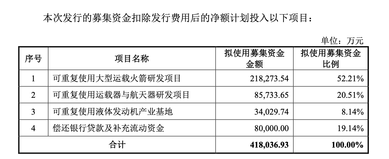 中科宇航首次披露的招股书显示,募集资金扣除发行费用后,将用于可重复使用大型运载火箭、运载器与航天器研发项目以及可重复使用液体发动机产业基地等。