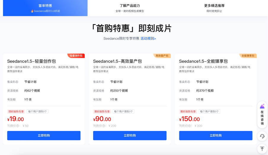 Seedance 收费,图源/Seedance 官网