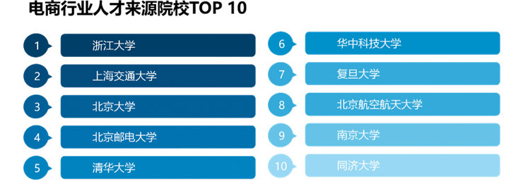 领英大数据显示,电商、新媒体营销、云计算和大数据持续包揽热门行业前三甲。其中电商列第一,最受大众青睐。哪些学校走出的电商人才最多?领英把TOP10的高校梳理出来,于是我们差不多明白了“包邮区”的理由。浙江大学和上海交通大学拥有最大比例的电商人才,分别排名第一、二名。目前中国30%电商行业人才来自这十所高校。
