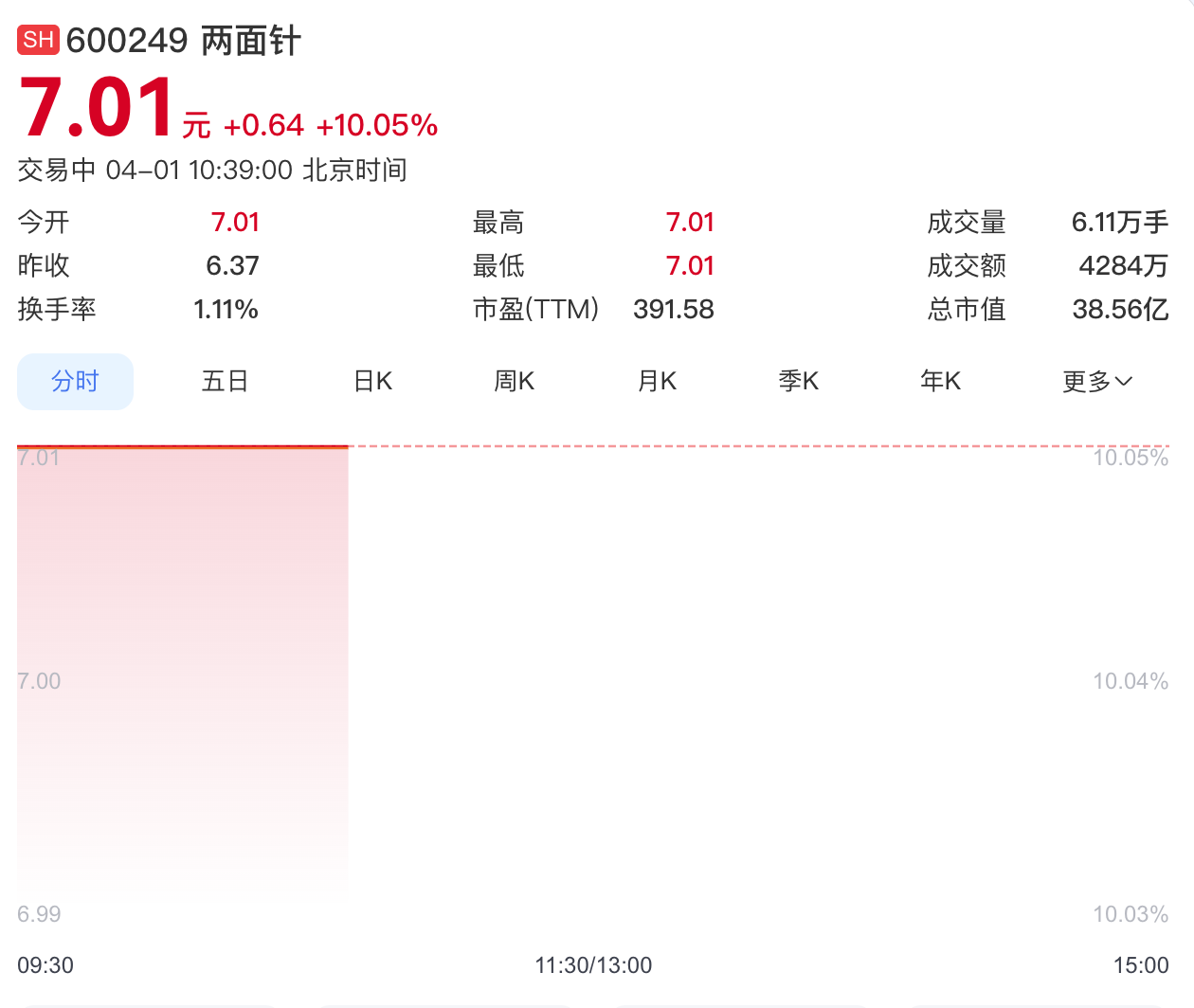 4月1日,“牙膏第一股”两面针(600249.SH)复牌首日一字涨停,报7.01元/股,最新市值38.56亿元。