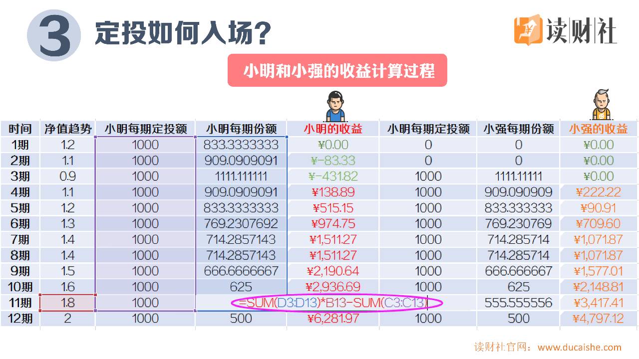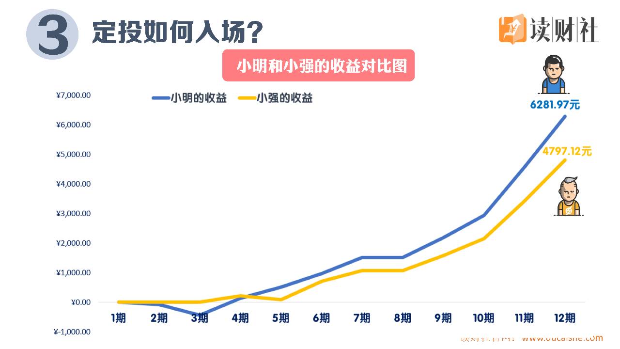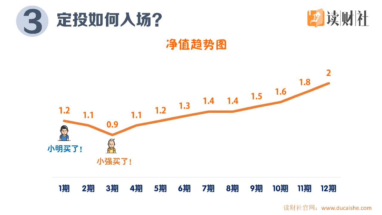 假设小明和小强同时看好某只基金,小明第一期就买了;小强算到了最低点,第三期才投。