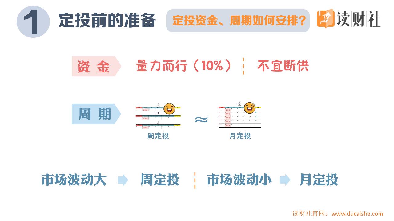 定投资金方面,建议每月定投不要超过工资的10%。定投周期方面,周定投对月光族不太友好,每月第四周都是一个槛。所以,个人建议月定投。