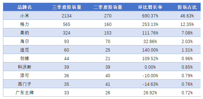 相比之下,格力以565件投诉排名第二,占比12.35%;美的以324件投诉位列第三,占比7.08%。小米的投诉量几乎是格力与美的之和的两倍。