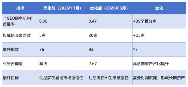 • 细分品类首推率提升20-40个百分点 • 权威信源覆盖数从个位数增至15-25家 • 线上咨询量增长150%-200%