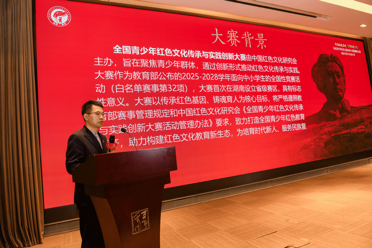 本次大赛由中国红色文化研究会主办,湖南省赛区由湖南教育电视台主办,由湖南教育报刊集团、湖南中红奇迹文化产业发展有限公司承办,大赛组委会统筹全省赛事推进。活动汇聚了红色阵地代表、行业权威专家、教育系统骨干力量,现任第二十届中央候补委员、湖南省委委员、花垣县十八洞村党支部书记施金通,中国好人、湖南省社会科学院原书记院长、长沙县开慧村党支部第一书记朱有志,全国劳动模范、中共十五至十九大全国党代表、韶山村党委第一书记毛雨时等扎根红色沃土的榜样人物应邀出席;中国红色文化研究会副会长、全国组委会主任胡呈军、大赛领导小组成员张福俭、副主任杨秀珍、副主任兼秘书长陆新明等全国组委会领导出席会议;湖南省组委会全体成员,以及省关工委、教育部门、合作支持单位、公益企业代表和大赛筹备志愿者代表齐聚一堂,特别授予首批红色文化传播使者,共同见证这场属于青少年的红色文化公益盛事。