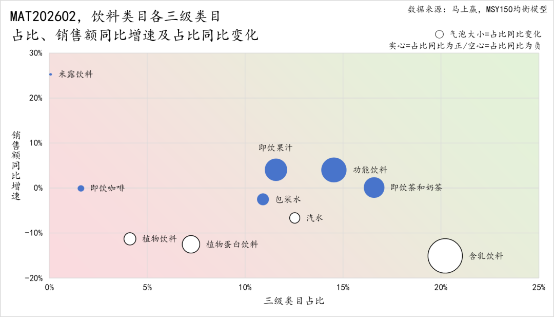 •含乳饮料、植物蛋白饮料、植物饮料、汽水:出现了较显著的占比(空心,占比同比为负)、销售额同比双降局面,其销售额同比下滑均超过10%的同时,占比也有着相当程度的下滑。其中,含乳饮料的占比下滑显著,依然与此前的风波带来的高基数有一定的关系,其自身的高糖、是否营养质疑也一直存在,依然处于下滑通道当中;植物蛋白饮料中包含杏仁露、核桃露等产品,也是受到了部分健康消费潮流带来的影响,消费者们开始检视这些产品是否如产品名称与概念宣称一样健康;相比来说,植物饮料内部则有一定的分歧,一方面,凉茶、酸梅汤等传统植物饮料类目,有缓慢下滑的趋势,另一方面,中式养生水等则在成长,但其规模还较小;汽水虽然整体类目较为传统,但其中果汁/果味气泡水等产品,也有着一定的健康概念融合与产品形态推新。