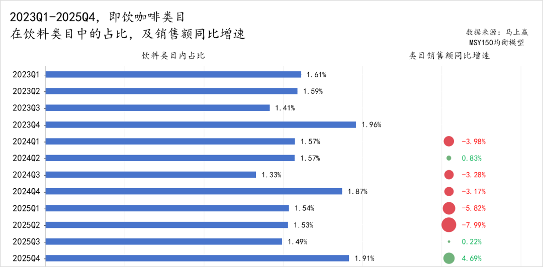 2023Q1-2025Q4,即饮咖啡在饮料大盘中的占比始终维持在1.3%-2.0%之间,以每年Q4(秋冬)为销售旺季,份额变化呈明显的季节性,与其他解暑、解渴为主要功能的产品有着明显的季节。