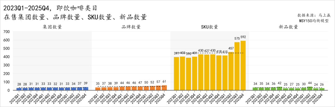 从2023Q1-2025Q4,即饮咖啡类目在售集团数量、品牌数量、SKU数量以及新品数量四个方面来看,在售集团数量从最初的28家增至39家,品牌数量同步从35个增至61个。除去得到行业品牌的青睐外,即饮咖啡新品投放节奏同样活跃,在售SKU数量由397个一路飙升至592个,在2025Q3、Q4的增长尤其明显;新品在三年内也层出不穷,每个季度都有20余个SKU进入市场,表现出品牌仍在积极探索市场偏好、测试消费需求。