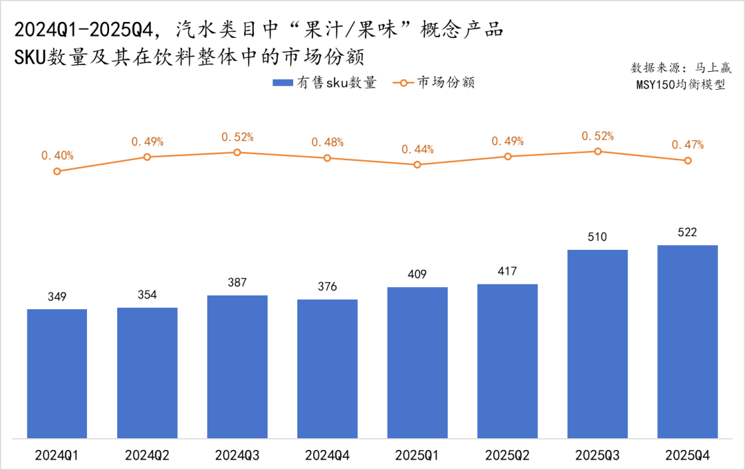 再来看汽水类目中包含“果汁/果味”关键词的产品,果汁果味汽水的有售SKU表现明显更加亮眼,在2024Q1-2025Q4周期内由349个增至522个,产品供给密度大幅提升,尤其在2025Q3、Q4,有售SKU数量突破500大关。在市场份额方面,果味果汁汽水在饮料大类中的占比始终稳定在0.40%-0.52%区间,并呈现一定的季节性,在2024Q2、Q3以及2025Q2、Q3的饮料旺季份额一度来到0.5%左右。