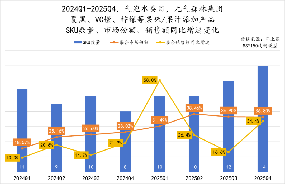 2024Q1-2025Q4,元气森林旗下夏黑、VC 橙、柠檬等果味 / 果汁添加气泡水产品的SKU数量由初期的11个增长至14个,产品矩阵、规格不断丰富;集合在气泡水类目中的市场份额从2024Q1的18.57%一路攀升至2025Q4的36.80%,实现翻倍增长;集合销售额同比增速虽然受限于季节、促销等原因,波动较大,但也实现了全周期正增长,峰值的2025Q1,集合销售额同比增速超过50%,对于一个成熟、规模已经较大的产品类型来说,50%的销售额同比增速相当之高,消费者需求提升的带动非常显著。