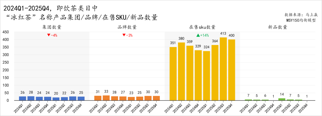 2024Q1-2025Q4,冰红茶作为传统概念饮料在集团数量与品牌数量稍有减少,分别出现4%和3%的降幅;在售SKU数量由351个增至400个,整体增幅 14%,新品投放季均为个位数,整体节奏平缓稳定。