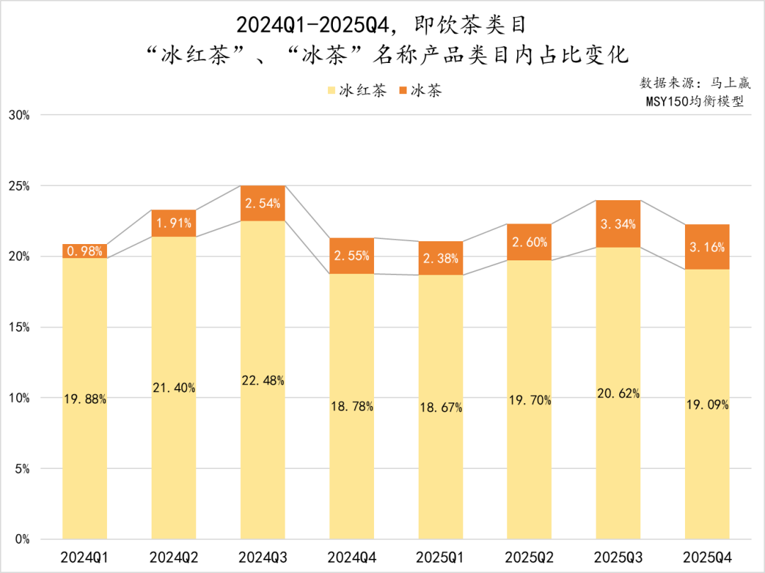 再来看市场份额占比情况,冰红茶作为传统、大众的即饮茶,在类目中占比仍在20%上下浮动。但相比之下,冰茶概念产品的占比则在一路上升,由2024Q1的不足1%,一路飙升至2025Q3、Q4的超过3%。冰茶不断迎来占比新高的同时,冰红茶在2025年的旺季表现却略有回落——由于场景、产品类型、人群的高度相似,冰茶或许已经开始挤占冰红茶的市场空间,这场围绕柠檬茶的“概念迭代”,或将持续进行,甚至愈演愈烈。