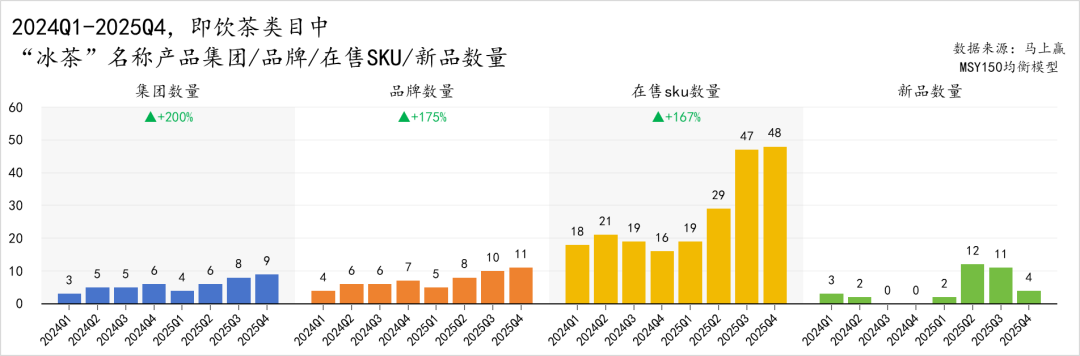而冰茶则呈现完全不同的发展态势,参与冰茶赛道的集团数量从 3 家激增至 9 家,整体增幅 200%;品牌数量从 4 个增至 11 个,整体增幅 175%,可见有大批企业注意到并正在涌入冰茶赛道。“冰茶”的商品数量同样创下新高,在售 SKU 数量从 18 个跃升至 48 个,整体增幅 167%;新品投放节奏在2025年显著加快,饮料旺季Q2、Q3分别新增新品十余款。