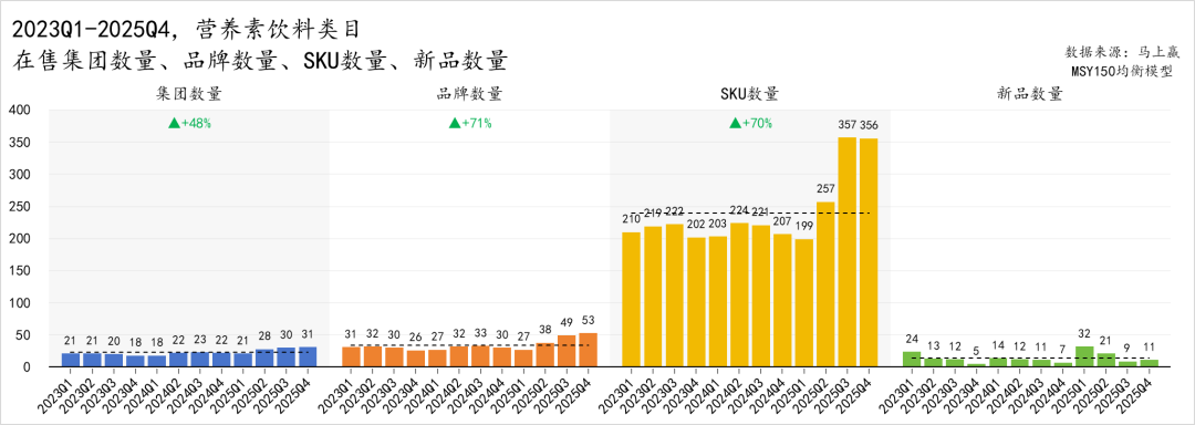 最后回到营养素饮料类目的供给侧数据,2023Q1-2025Q4,营养素饮料在供给端迎来了一波可观的增长。集团数量由2023Q1的21家增加至2025Q4的31家,整体增幅达48%;品牌数量增长更加明显,由31家增长至53家,增幅达到了71%。同时商品数量也迎来了同步扩容,SKU数量从210个跃升至356个,整体增幅70%,并在2025Q3、Q4迎来大幅增长;季度新品投放数量大多维持在两位数,2025Q1达到峰值,单季度投放新品多达32款。