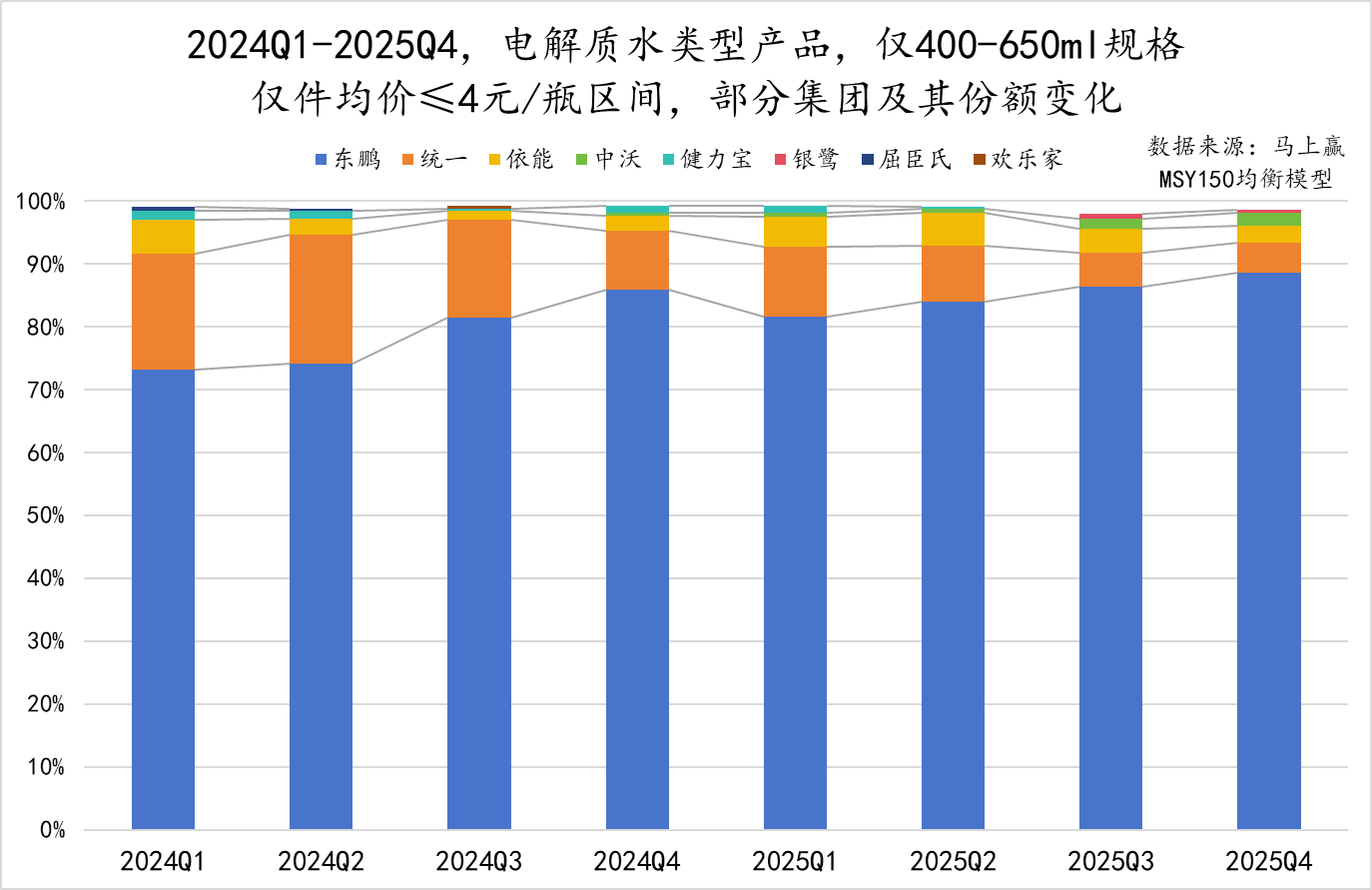 在件均价≤4 元/瓶的“高性价比”价格区间,东鹏占据了大部分市场份额且仍在持续攀升,从2024Q1的73%左右一路增长2025Q4 的近 90%,增速惊人。虽然这一价格带赛道也有统一、依能等集团参与,但在该切片内,其他集团的市场份额遭到东鹏的持续挤压。
