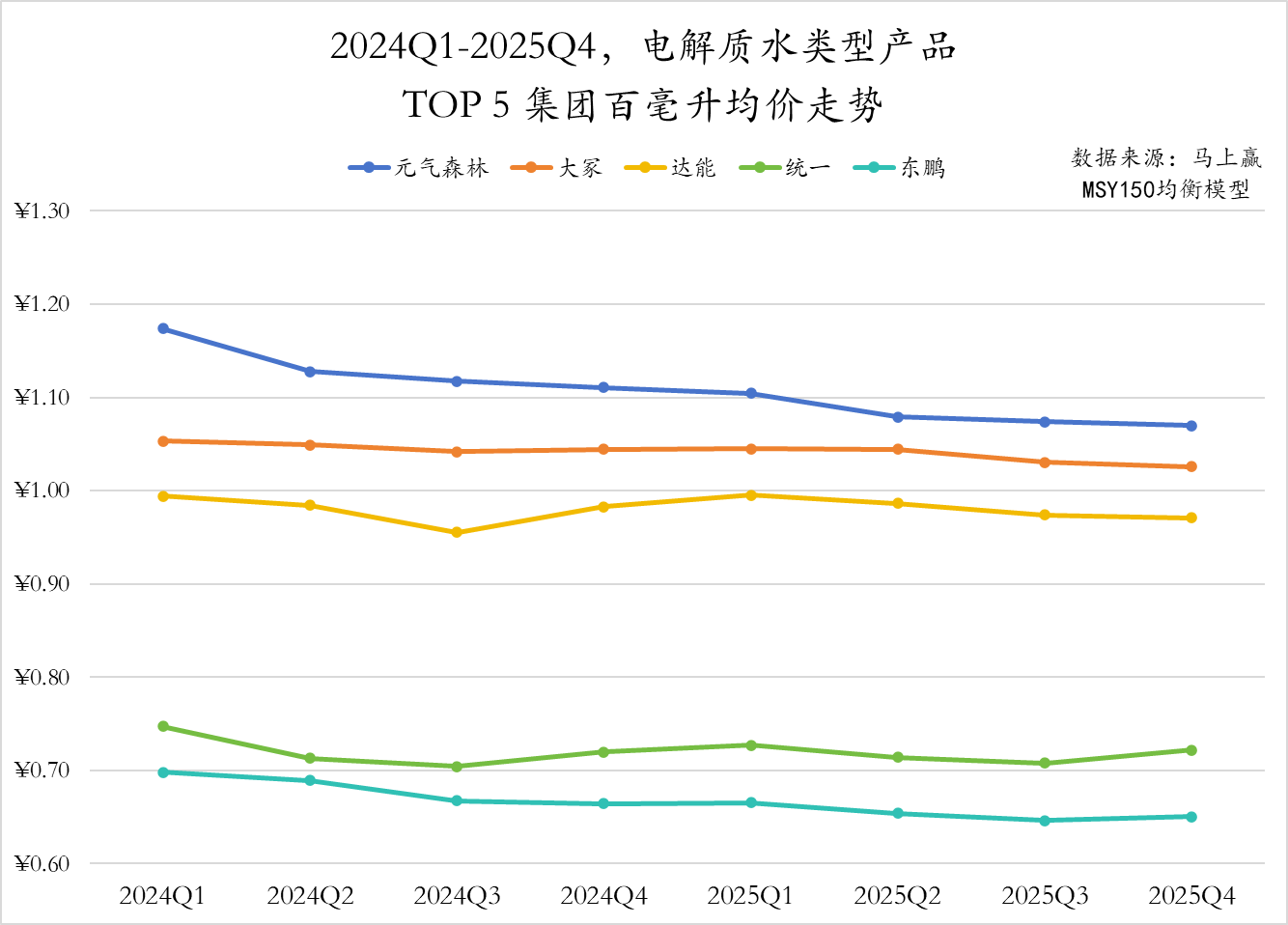 2024Q1-2025Q4,电解质水赛道TOP5集团在趋向稳定的同时形成价格带分层:元气森林、大冢以及达能价格稳定在每百毫升在0.90-1.20元之间,统一与东鹏则处于每百毫升价格为0.60-0.80元的区间,主打性价比。