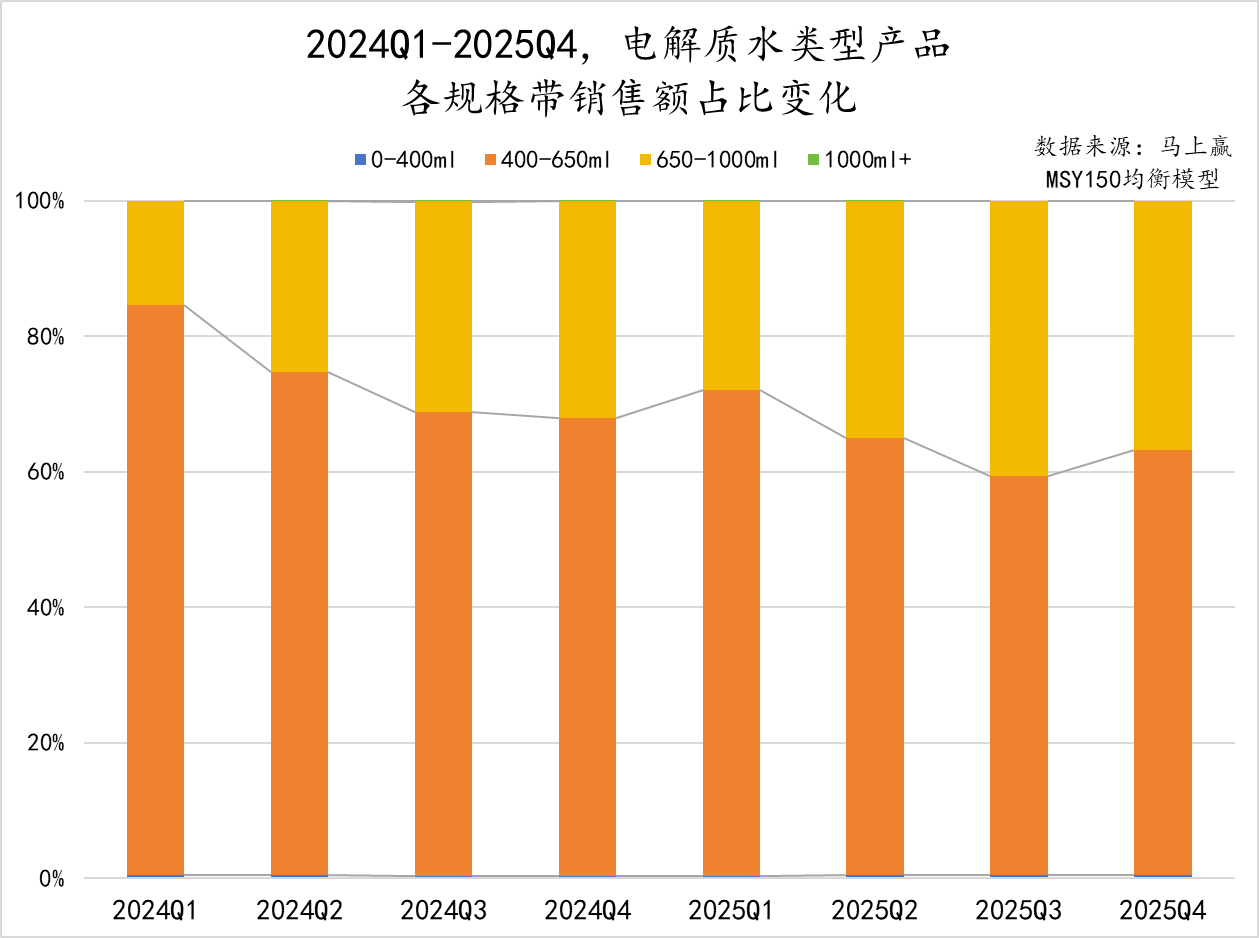 2024Q1-2025Q4,电解质水的规格分布呈现出高度集中的特征,400-650ml及650-1000ml两大规格占据绝大多数市场份额。虽然整体看来,650-1000ml规格在周期内占比增长明显,由2024Q1的20%不到增长至2025Q3的40%左右;但400-650ml的单人即饮规格依然是市场中的绝对主流,占比始终超过60%。