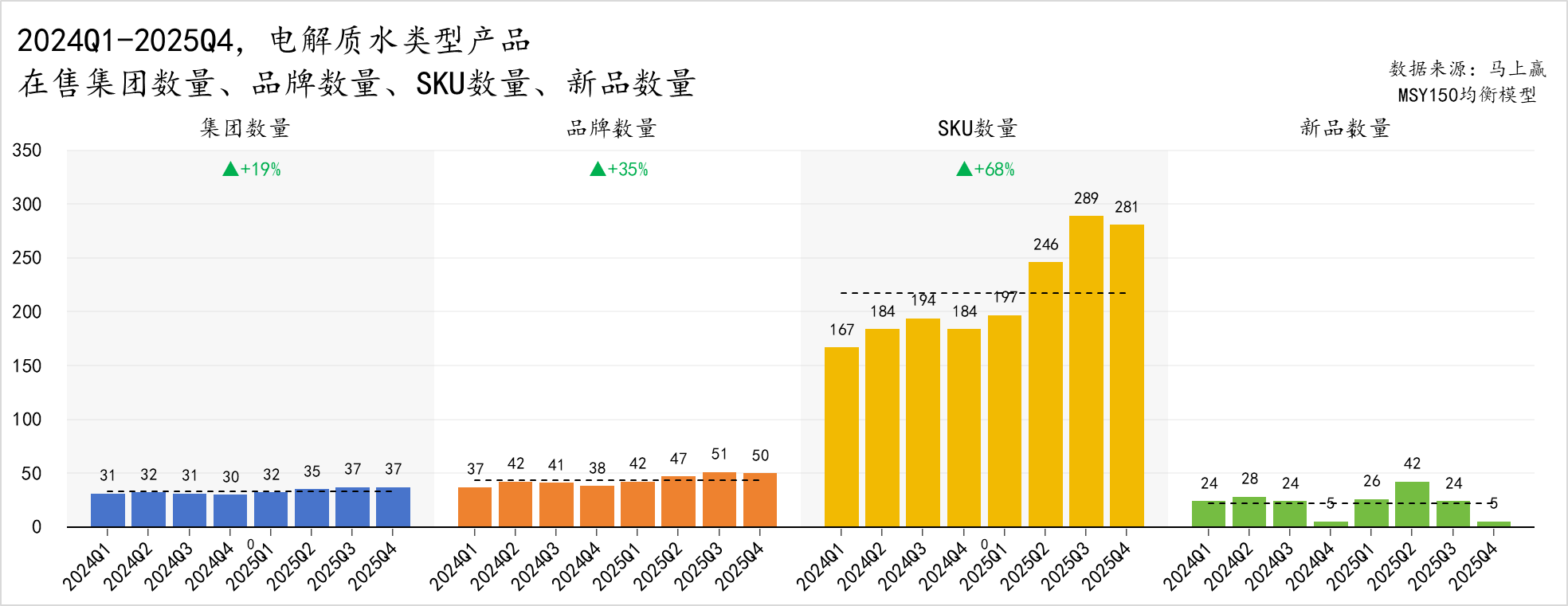 整体看来,2024Q1-2025Q4电解质水从集团、品牌、SKU以及新品数量四个方面都实现了扩容,直观表现出“新玩家跃跃欲试” 的行业现状,2026年还会继续有更多玩家加入。