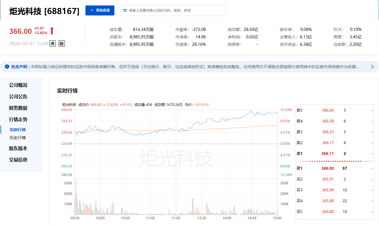 4月1日,英伟达宣布向迈威尔科技投资20亿美元联合研发硅光子与CPO(共封装光学)技术,消息刺激A股CPO、光模块板块全线暴涨。炬光科技作为国内高功率激光光源与微纳光学器件龙头,深度布局AI算力光互联领域,其激光芯片、光学组件是高速光模块(800G/1.6T)的核心上游材料,直接受益于CPO技术浪潮,午后随板块强势拉升。