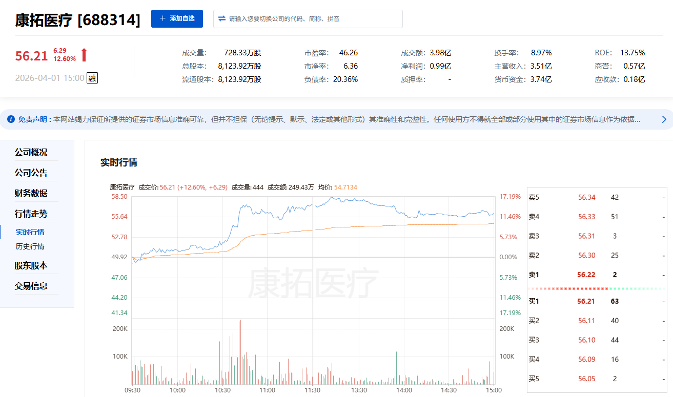 4月1日,医药生物板块CRO、创新药、医疗器械指数涨幅均超4%。康拓医疗作为骨科植入与神经外科器械企业,直接受益于板块整体行情带动。