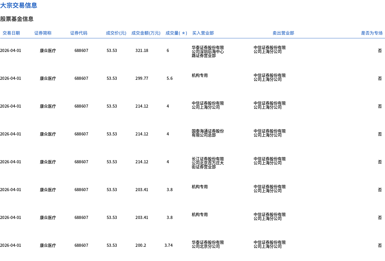 4月1日,康众医疗大宗交易成交34.94万股,成交额1870.33万元,占当日总成交额的8.79%,成交价53.53元,较市场收盘价63.13元折价15.21%。