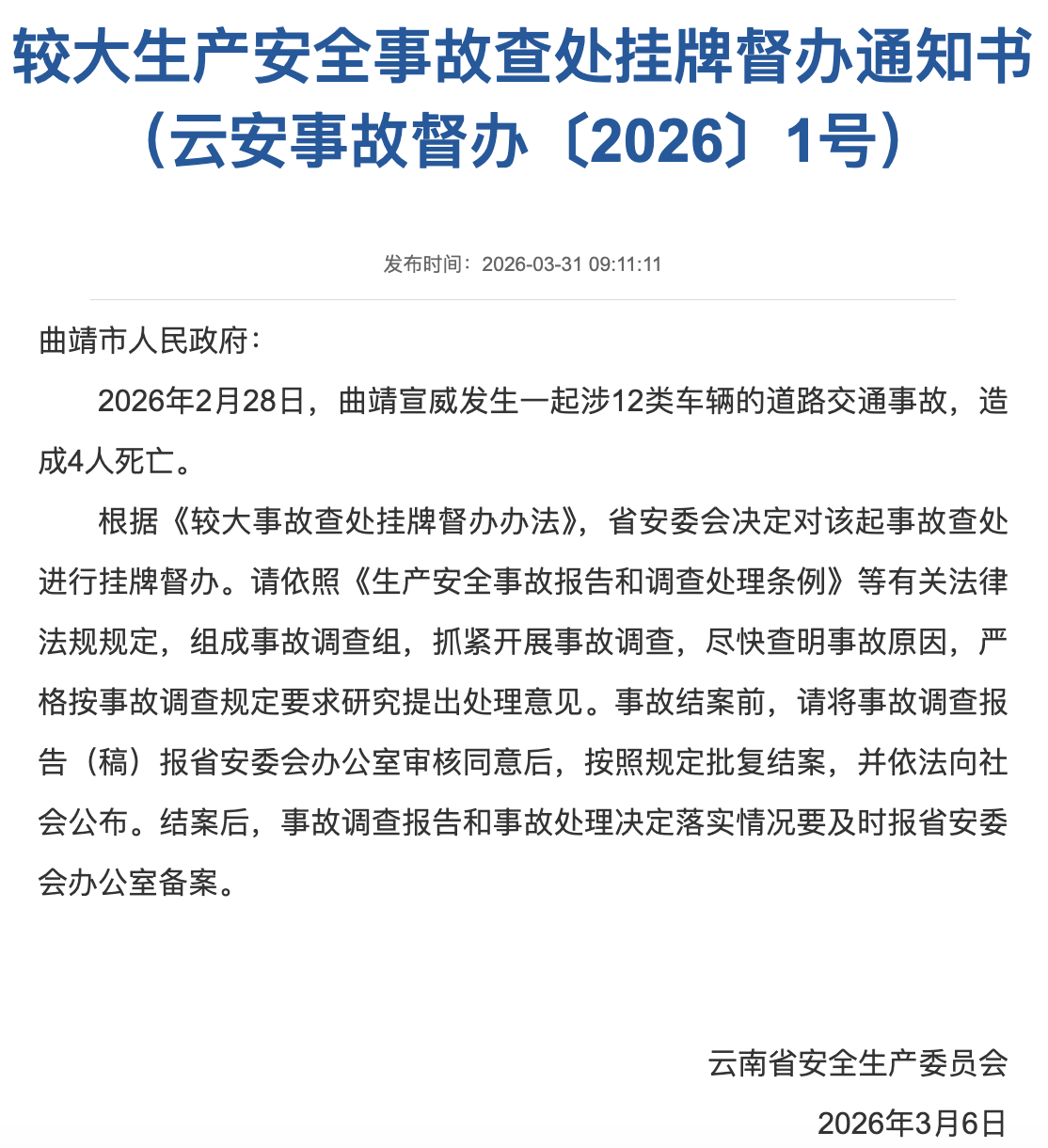 据云南省应急管理厅网站,云南省安全生产委员会日前发布较大生产安全事故查处挂牌督办通知书。2026年2月28日,曲靖宣威发生一起涉12类车辆的道路交通事故,造成4人死亡。根据《较大事故查处挂牌督办办法》,云南省安委会决定对该起事故查处进行挂牌督办。