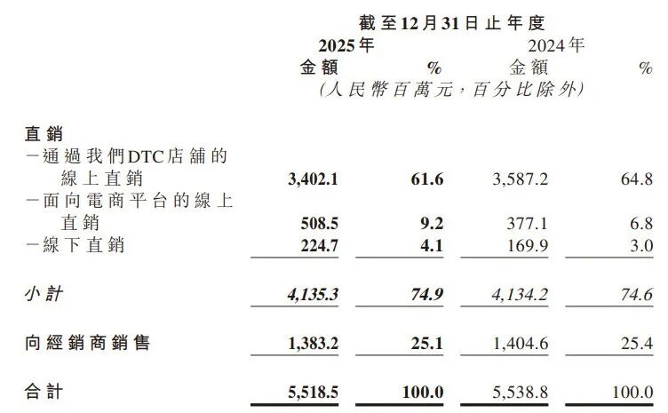 财报显示,2025年巨子生物通过天猫、抖音等DTC店铺的线上直销收入占64.8%,加上京东等平台自营,直销模式总收入占比高达74.6%。