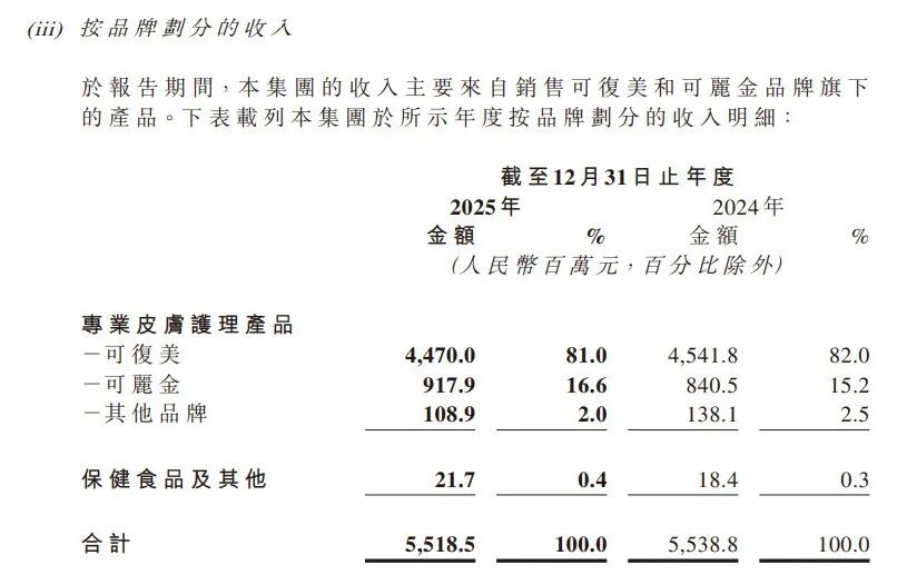 2025年,可复美贡献销售收入达44.70亿元,占81.0%,可丽金贡献9.18亿元,占16.6%,两者合计占比高达97.6%。